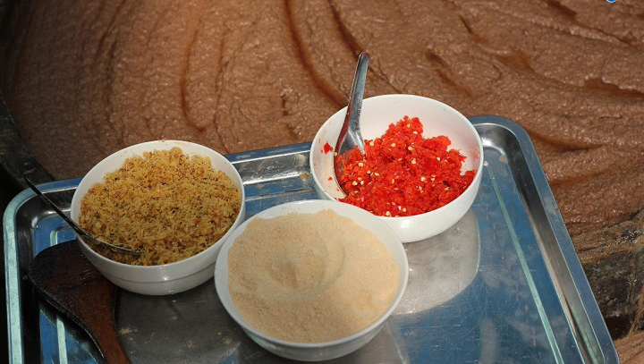 Bột thính gạo rang kỹ, riềng tỏi tươi xay nhuyễn, ớt ngọt là những gia vị tự nhiên góp phần làm cho màu sắc và mùi vị của mắm tép Lê Gia được thom ngon trọn vị