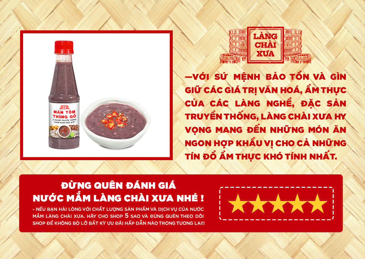 - Mắm tôm thùng gỗ Làng Chài Xưa rất thơm ngon, được làm công phu từ tôm tép biển tươi. Nguyên liệu chính để ra được "MẮM TÔM" trứ danh ngon khó cưỡng: Tôm, Tép, Muối biển tinh khiết giúp món ăn ngon hơn rất nhiều.