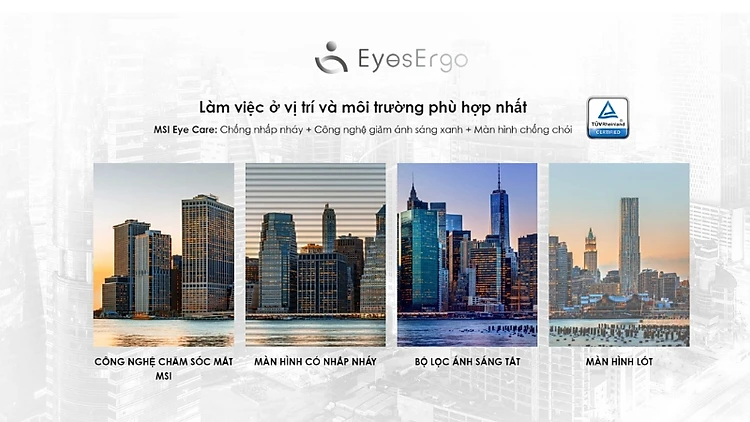 Một trong những điểm nổi bật của mẫu màn hình văn phòng MSI PRO MP273AW là các công nghệ bảo vệ mắt tiên tiến. Công nghệ Anti-Flicker giúp giảm hiện tượng nhấp nháy, từ đó giảm mỏi mắt khi sử dụng trong thời gian dài. Chế độ Less Blue Light PRO giảm thiểu ánh sáng xanh có hại, bảo vệ mắt và cải thiện giấc ngủ. Lớp phủ Anti-Glare giúp giảm độ chói, tạo điều kiện làm việc thoải mái ngay cả trong môi trường ánh sáng mạnh.