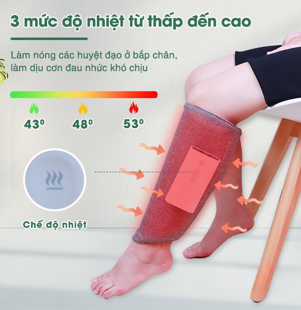 ✓ 3 mức nhiệt sưởi nóng làm ấm: Với 3 mức nhiệt 43 - 48 - 53 độ C sẽ giúp làm ấm, hỗ trợ thư giãn và làm dịu cơn đau nhức, tăng lưu thông khí huyết, giảm tình trạng tê bì vùng bắp chân.