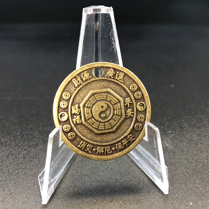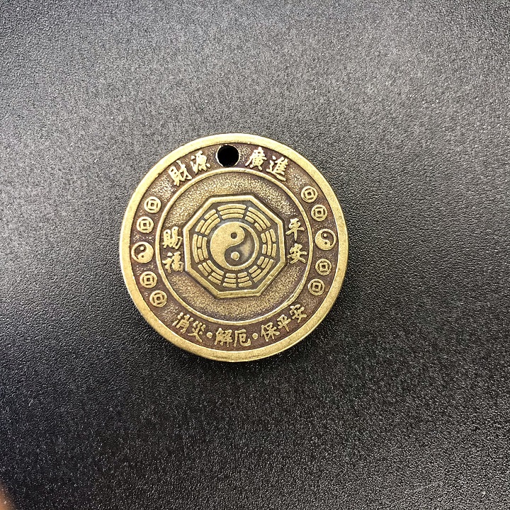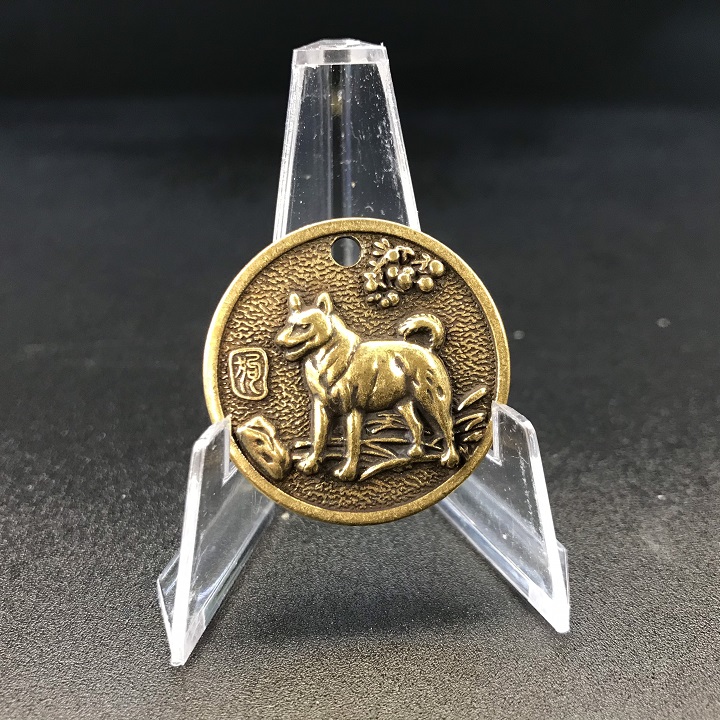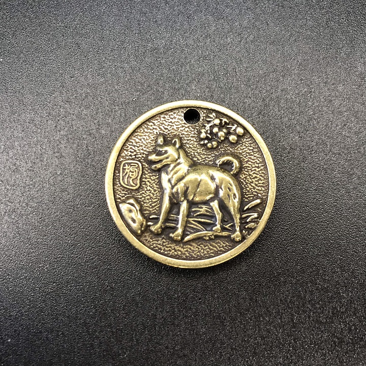 Mô tả sản phẩm | Mặt đồng xu đồng hình con Chó là một mặt đồng xu bằng đồng, với mặt trước là hình con Chó, mặt sau là hình bát quái cùng các chữ tiếng Trung. Trên đồng xu cũng đã được khoét một lỗ nhỏ để có thể xỏ móc khóa vào hoặc luồn dây để đeo. |