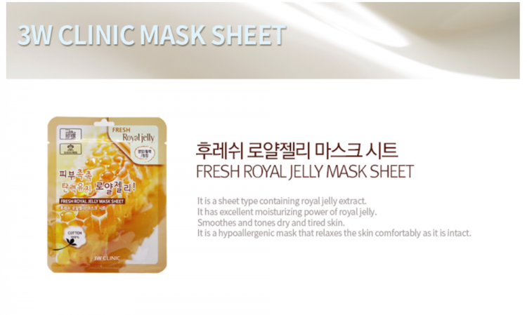 Mặt nạ 3W Clinic Fresh Royal Jelly Mask Sheet 23g với thành phần sữa ong chúa giàu dưỡng chất, giúp dưỡng da, làm săn chắc da, cho da mịn màng. Đặc biệt, chất chống oxi hóa có trong mật ong, giúp ngăn chặn quá trình lão hóa, cho da căng bóng, đầy sức sống