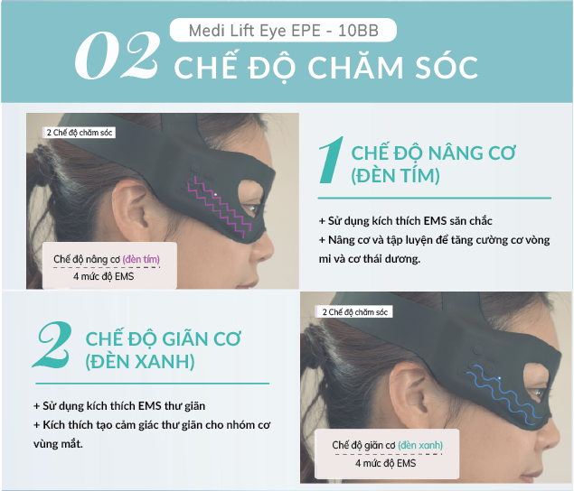 YA-MAN Medi Lift Eye EPE-10BB với 2 chế độ trị liệu Stretch Mode (Giãn cơ) và Lift Mode (Nâng cơ) được thiết kế riêng để chăm sóc đặc biệt cho vùng da mắt, tập trung tập luyện các nhóm cơ mắt từ đó tác động lên cả vùng mắt.