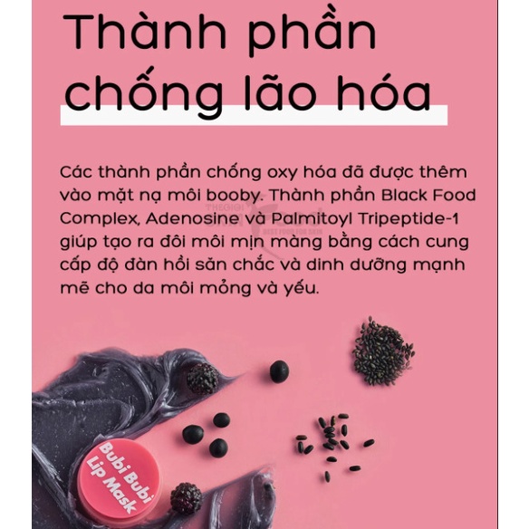 - Chứa phức hợp các thực phẩm đen bao gồm chiết xuất mâm xôi, gạo đen, hạt mè đen và đậu đen chứa giàu hoạt chất Anthocyanins với khả năng chống oxy hóa mạnh mẽ giúp cải thiện các nếp nhăn do lão hóa xuất hiện trên môi, phục hồi vẻ căng mọng cho môi hiệu quả.