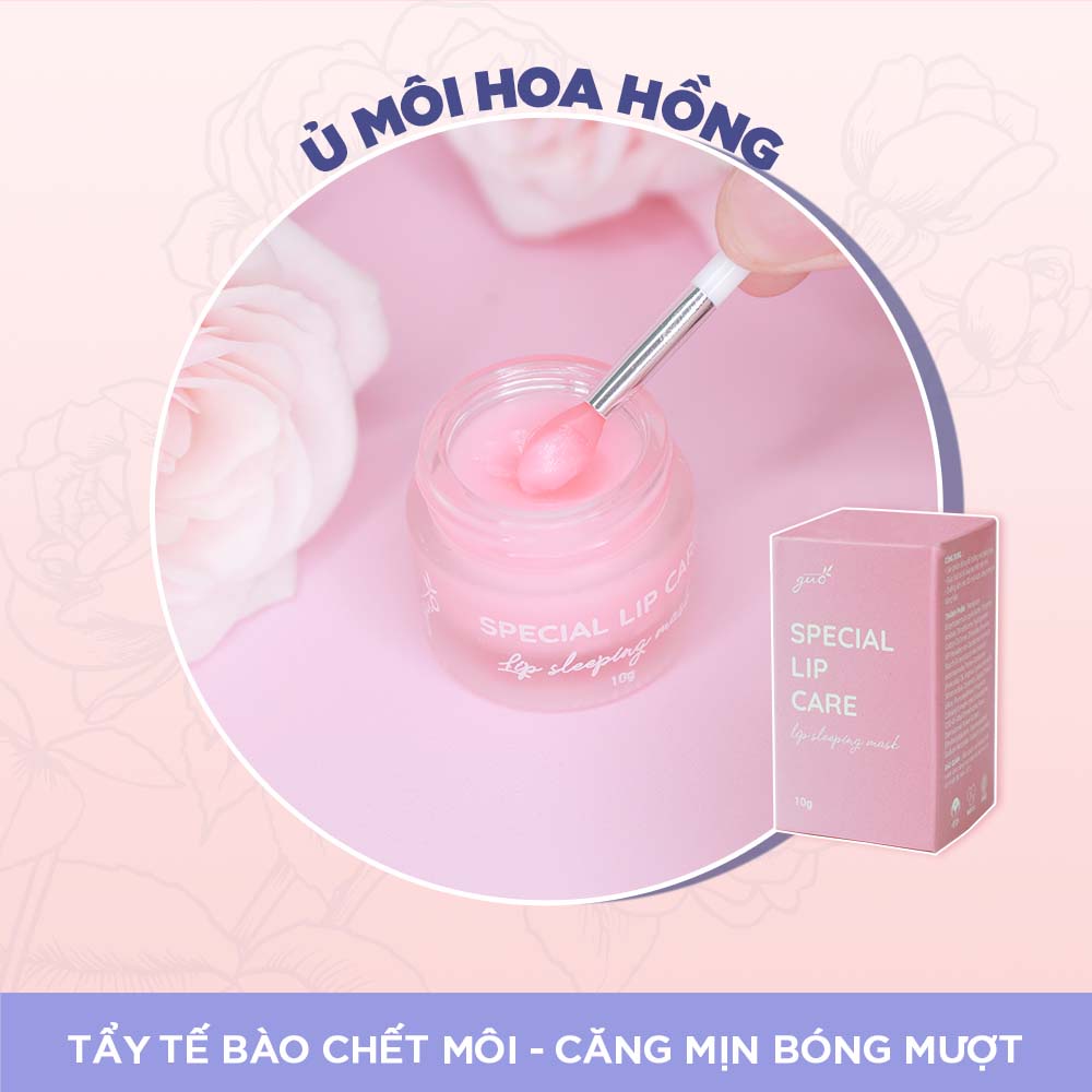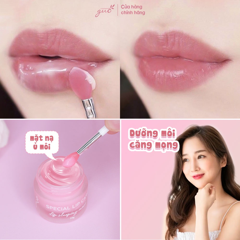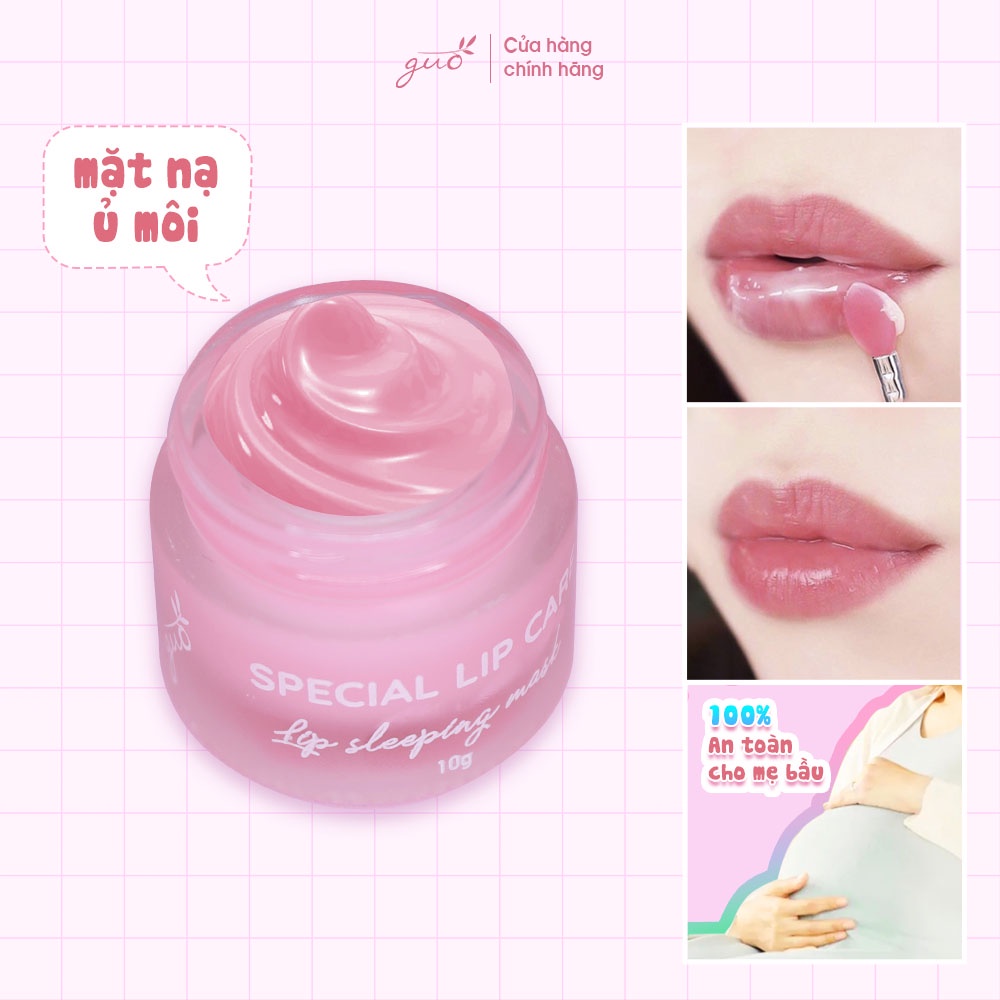 Special Lip Care GUO - Ủ môi hoa hồng là sự kết hợp giữa chiết xuất hoa hồng, dầu quả bơ, dầu Argan, dầu Jojoba, bơ Shea cung cấp dưỡng chất cần thiết cho đôi môi luôn căng mọng, phục hồi sự hồng hào cho môi. Để qua đêm để cảm nhận đôi môi mịn màng và mềm mại. Ủ môi hoa hồng nhà GUO với chiết xuất 100% thiên nhiên từ các loại dầu, bơ thực vật là một trong những sản phẩm được khách hàng rất yêu thích, giúp chăm sóc đôi môi ngay cả trong giấc ngủ, dễ dàng làm sạch tế bào chết trên môi, đồng thời dưỡng ẩm cho đôi môi luôn mềm mượt, căng mọng và đàn hồi cùng với mùi thơm nhẹ nhàng từ chiết xuất tự nhiên hoa hồng và dâu.