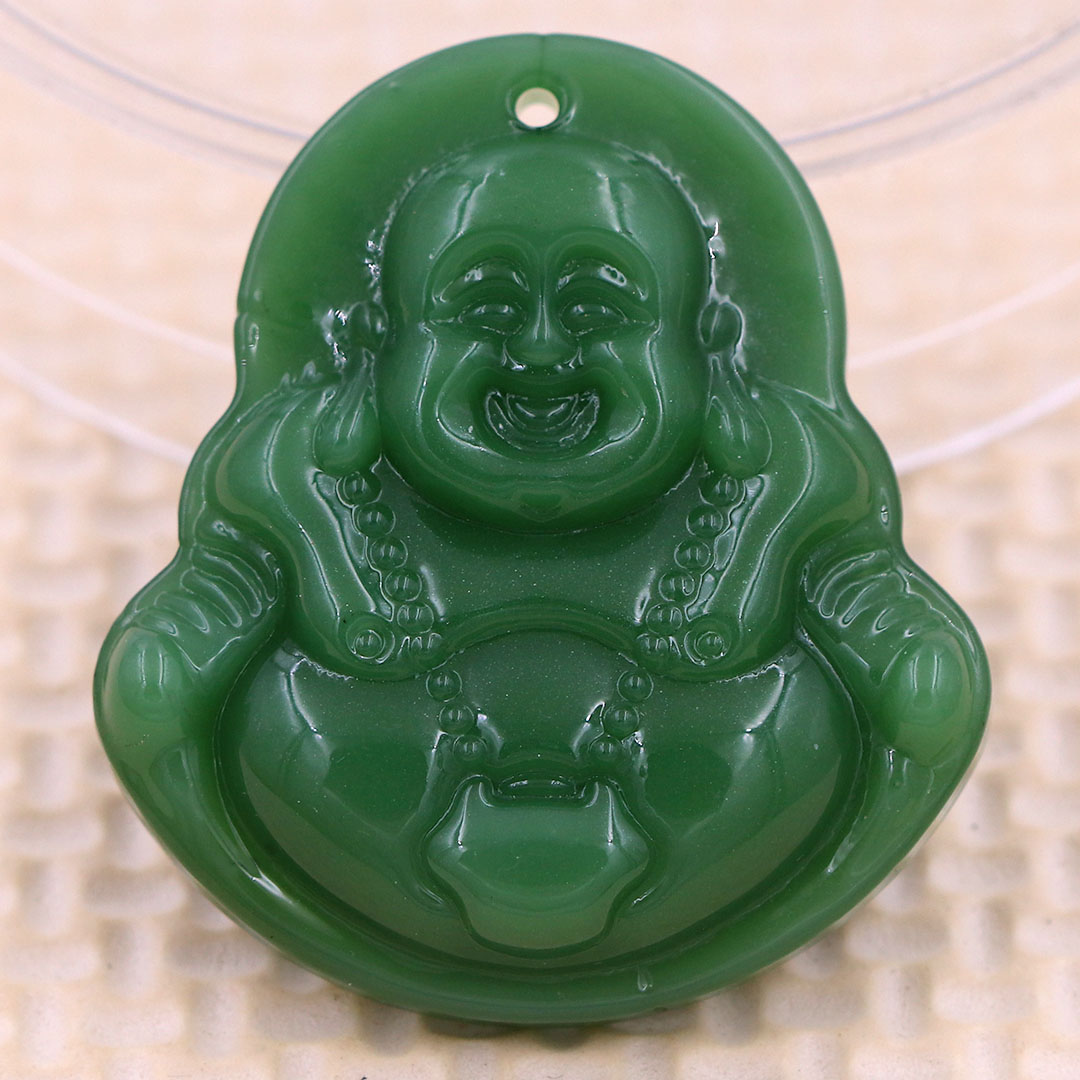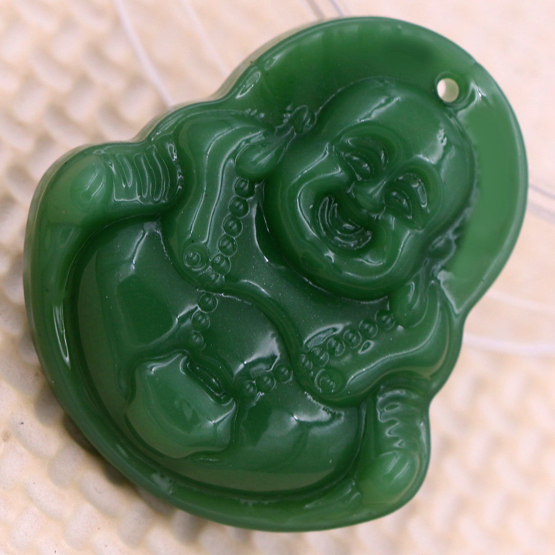 Thông tin sản phẩm: Mặt Phật Di lặc đá xanh 4.3 cm kèm vòng cổ dây cao su xanh + móc inox trắng, mặt dây chuyền Phật cười