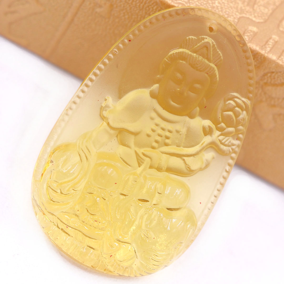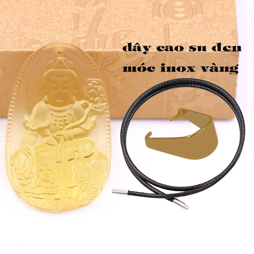 Thông tin sản phẩm: Mặt Phật Phổ hiền pha lê vàng 3.6 cm kèm móc và vòng cổ dây cao su đen, Mặt Phật bản mệnh