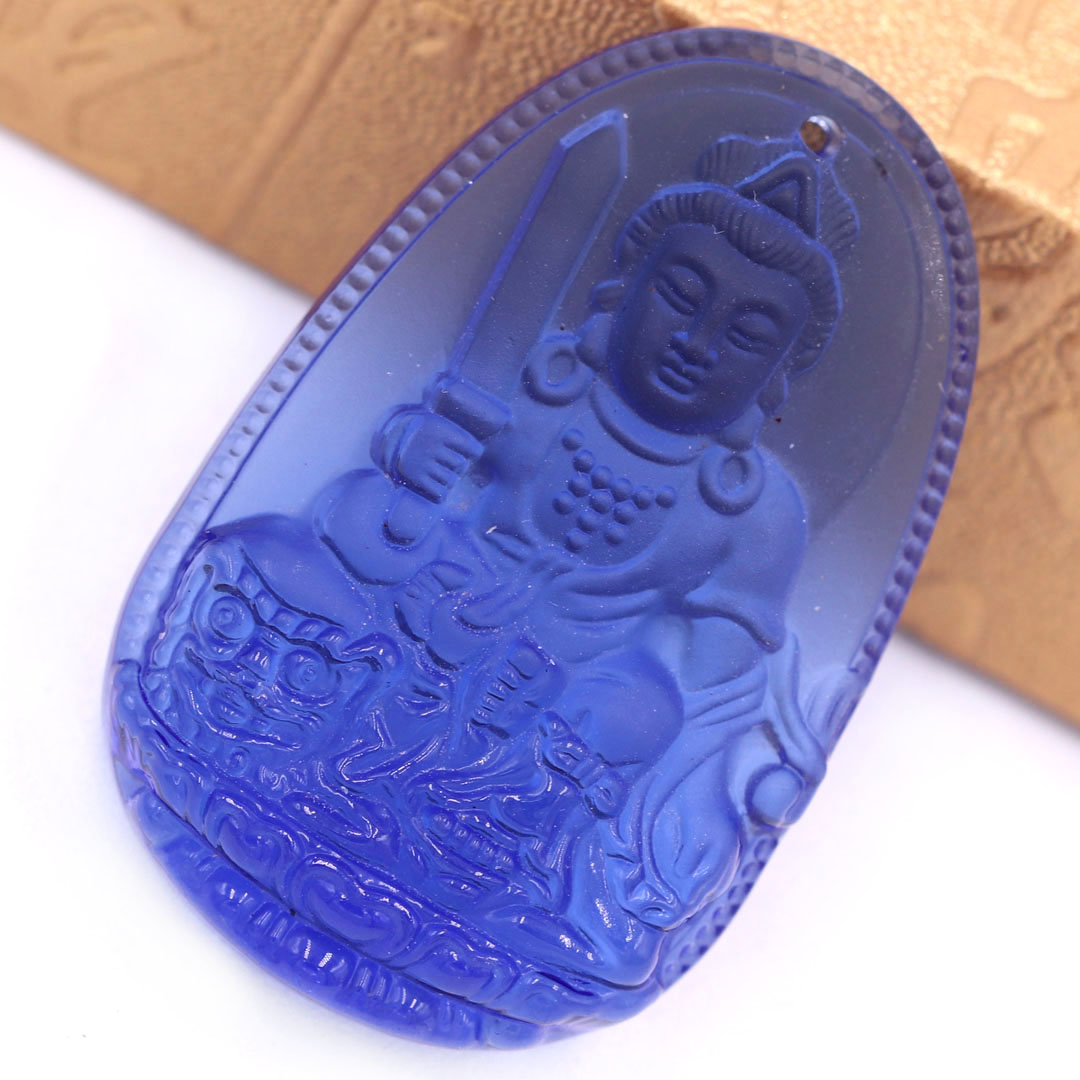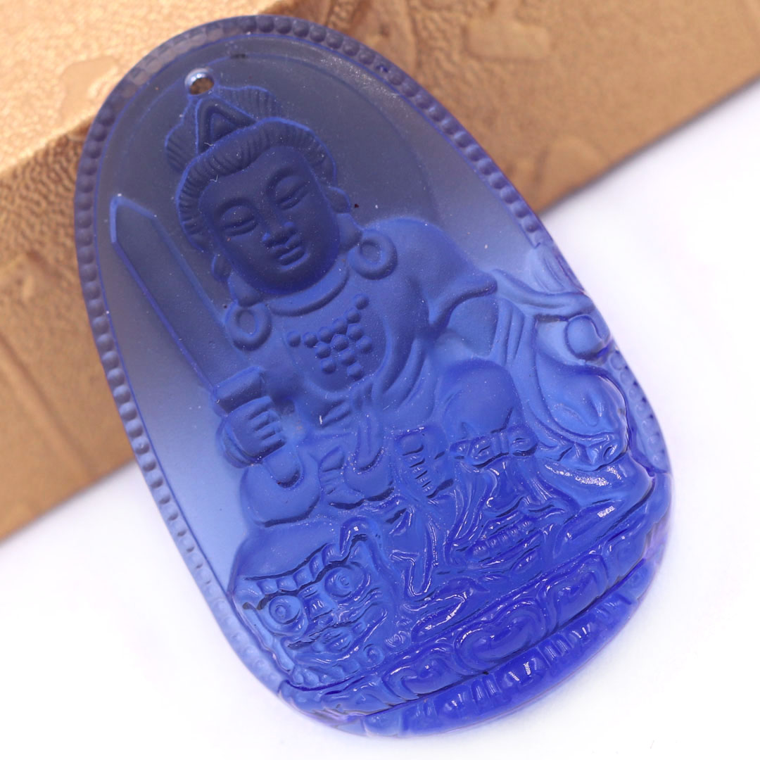 Thông tin sản phẩm: Mặt Phật Văn thù thuỷ tinh xanh dương 3.6 cm kèm móc và vòng cổ dây cao su đen, Mặt Phật bản mệnh