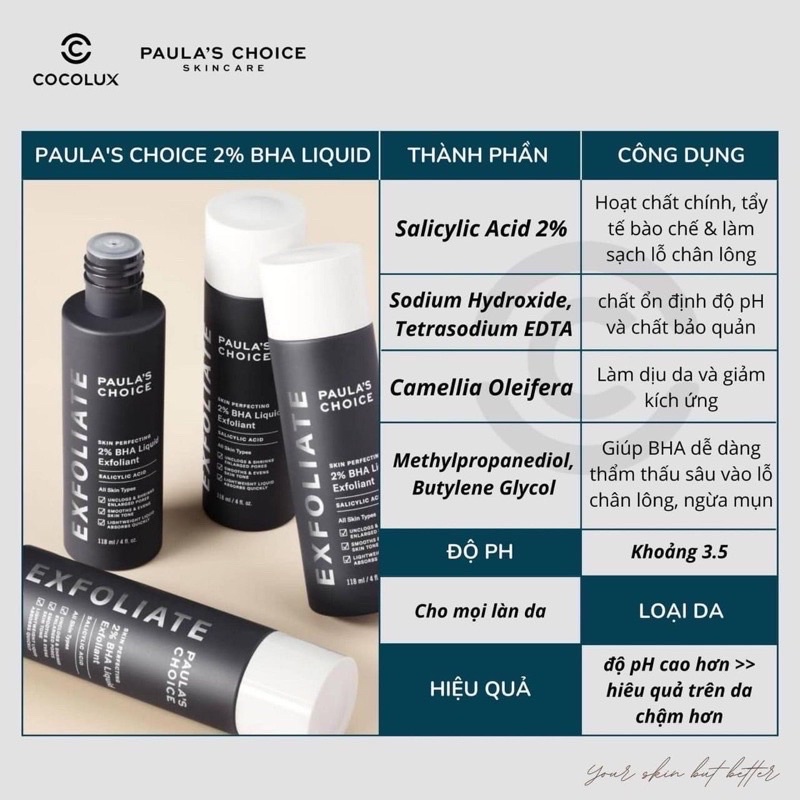 - Sản phẩm chứa thành phần chính là Salicylic Acid (BHA), giúp đẩy nhanh chóng bụi bẩn và bã nhờn lên bề mặt da. Nhờ vậy, tình trạng mụn ẩn được cải thiện nhanh chóng. Bên cạnh đó, còn hỗ trợ giảm mụn.