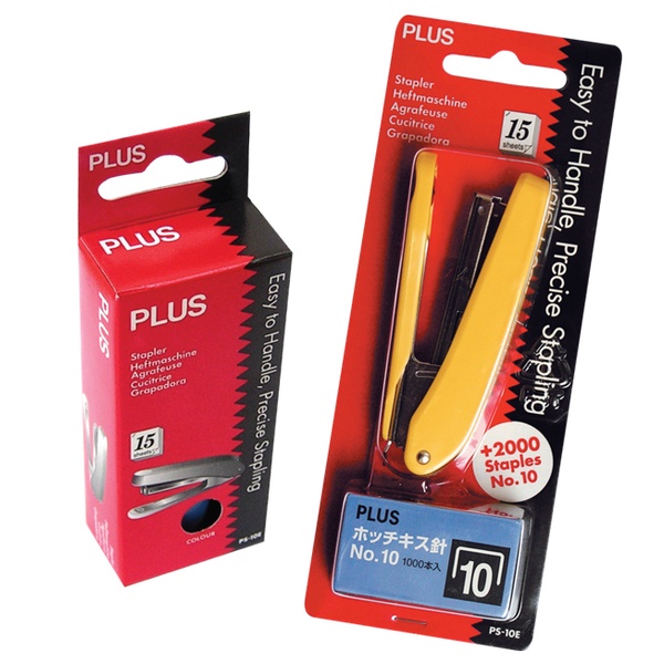 Máy bấm kim số 10 Plus Đặc điểm: là sản phẩm được thiết kế nhỏ gọn với trọng lượng chỉ 50g. Bấm được nhiều giấy hơn, dễ canh chỉnh vị trí bấm và hộc chứa kim chứa được gấp đôi so với sản phẩm thông thường.