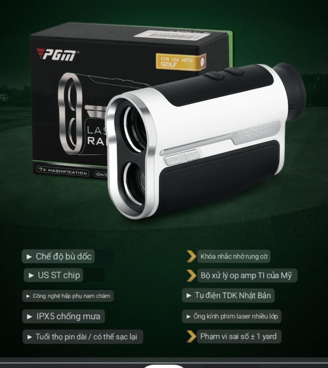3. Tính năng: Là dòng ống nhòm đo khoảng cách Laser chuyên dụng cho chơi Golf. Sử dụng bộ xử lý chip ST tiên tiến nhất. So với máy đo JQ011, máy đo JQ013 được nâng cấp với thuật toán độ dốc mới, chế độ bù dốc bằng công tắc một phím. Khi độ dốc dương, chọn khoảng cách đánh lớn hơn khoảng cách thực tế Khi độ dốc âm, khoảng cách đánh nên gần hơn. Chế độ khóa nhanh cột cờ M2, sau khi cột cờ bị khóa thiết bị sẽ rung và một dấu nhắc sẽ nhấp nháy trong phạm vi để bạn biết cờ đang bị khóa với phần sân chính xác. Tích hợp nam châm hoàn hảo, lực hút mạnh, có thể gắn máy đo vào phần kim loại của túi gậy, xe đẩy, mà không lo nó bị rơi ra. Ống kính phim Laser nhiều lớp. Ống kính quang học độ phóng đại cao gấp 7 lần giúp thu hẹp khoảng cách quan sát. Tích hợp hệ thống chống rung giúp hình ảnh hiển thị rõ nét, trường nhìn sáng và khoảng cách đo xa hơn. Chế độ lấy nét nhanh giúp xác định nhanh vị trí trong sân Golf, phương pháp đo đơn giản, thao tác nhanh chóng dễ dàng khi chơi Golf. Thân máy áp dụng công nghệ IPX5 chống mưa và chống sương mù, có thể sử dụng chơi Golf ngoài trời mà không lo sợ máy bị thấm nước và ảnh hưởng bởi sương mù.