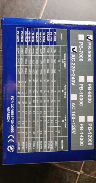 1.Máy bơm Periha PB-5000 Chế độ 1: 10W; 4000l/h; 2m; Output 27-34-42-48 Chế độ 2: 15w; 4500l/h; 2,5m; Output 27-34-42-48 Chế độ 3: 20w; 5000l/h; 3m; Output 27-34-42-48