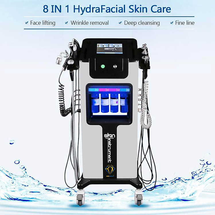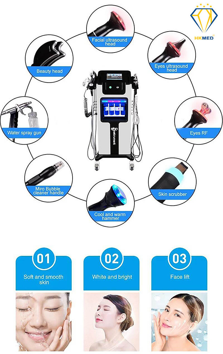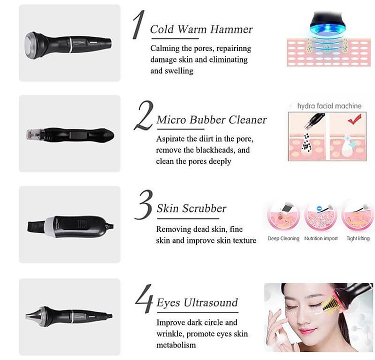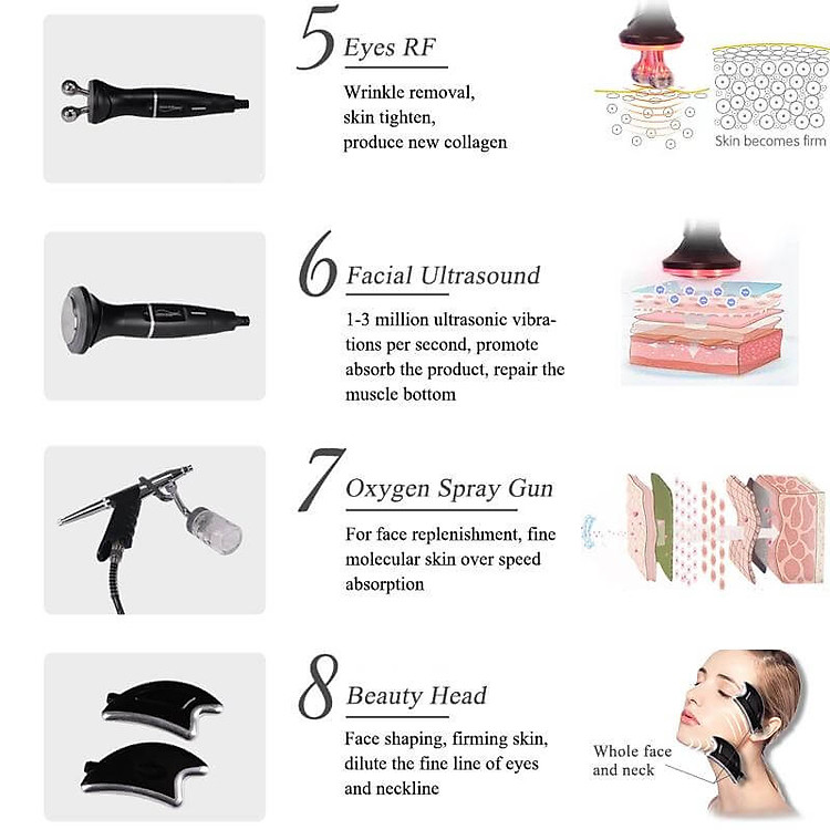 Được trang bị 8 tay cầm: cold warm hammer, hydra peeling handle, ultrasonic skin scrubber, eyes ultrasound, face ultrasound, eyes rf, oxygen spray mist gun, beuaty head