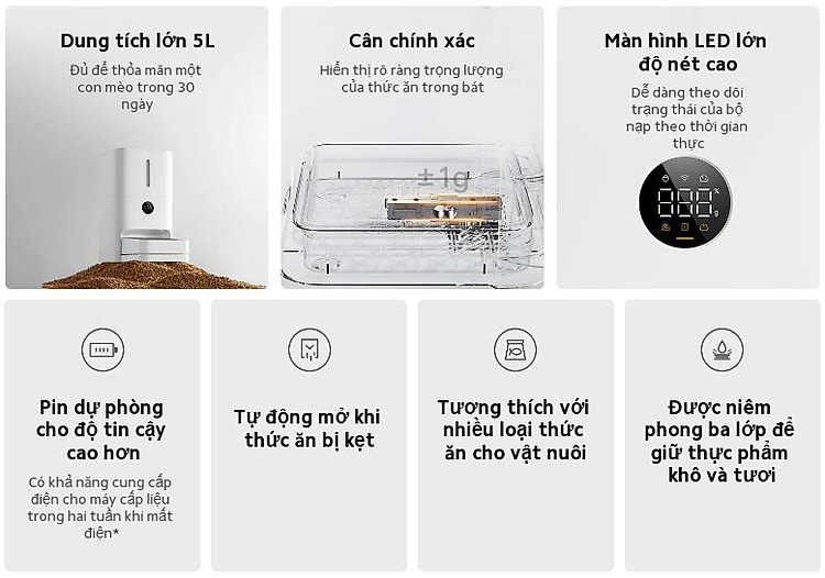 Hộp đựng thức ăn 5L có thể chứa khoảng 2,5kg thức ăn cho mèo, đủ cho một con mèo trưởng thành ăn trong 30 ngày