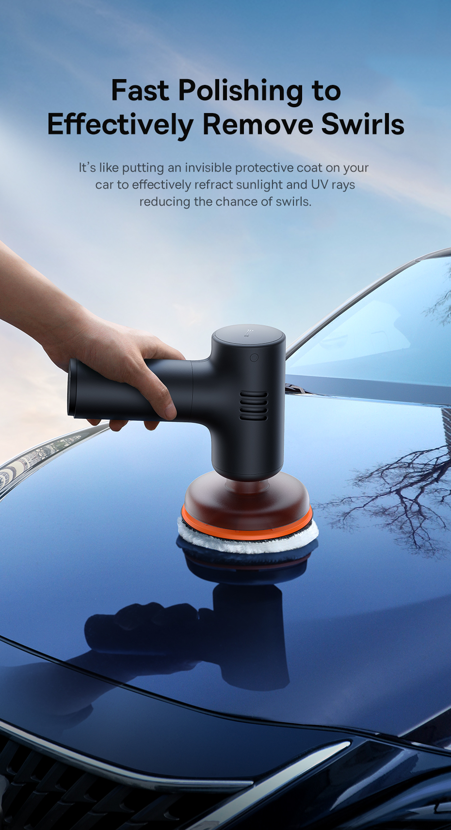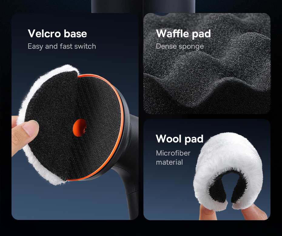 Sản phẩm được trang bị bộ đệm bằng mút mềm mại và các đầu đánh bóng đa năng, giúp đánh bóng và làm sạch các bề mặt khác nhau của xe hơi một cách dễ dàng và không gây trầy xước.