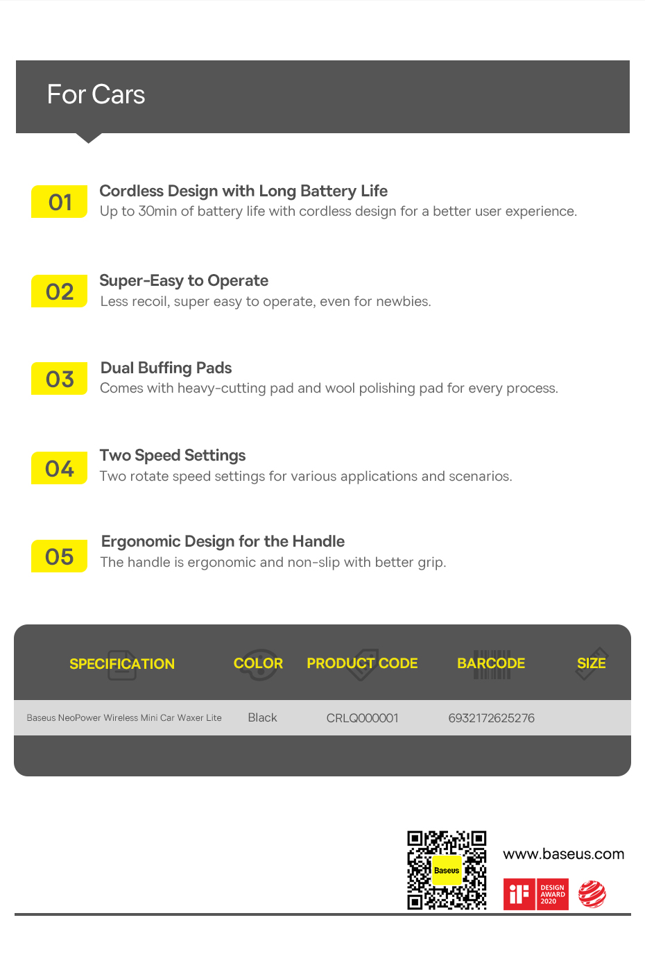 Ngoài ra, Máy Đánh Bóng Xe Hơi Baseus NeoPower Wireless Mini Car Waxer Lite còn có thiết kế cực kỳ đẹp mắt với màu sắc trang nhã, đồng thời cũng rất tiện dụng khi có thể gấp gọn và mang theo bên mình trong các chuyến đi xa.