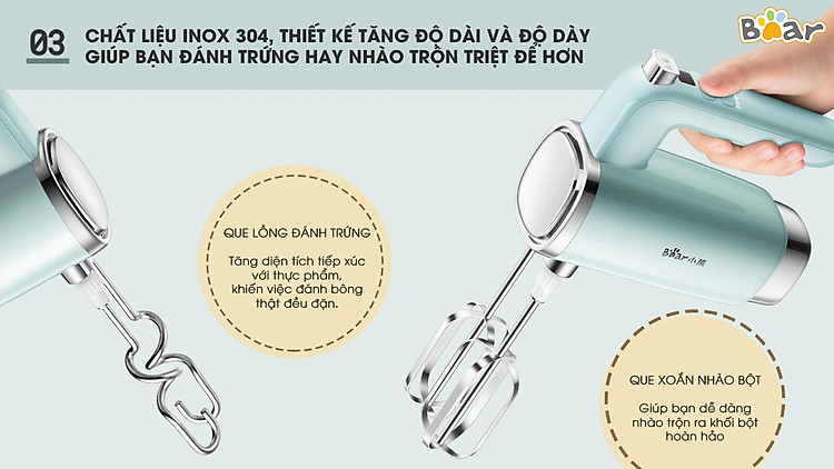 Máy đánh trứng để bàn Bear DDQ-B03V1 có 4 que đánh tháo rời dễ dàng: 2 que đánh trứng, 2 que trộn bột. Que đánh được làm bằng inox 304 không gỉ, cứng cáp giúp đánh bông và trộn bột đều.