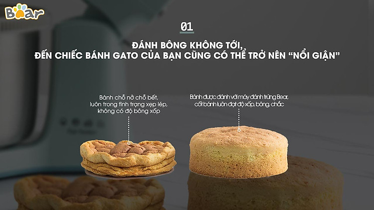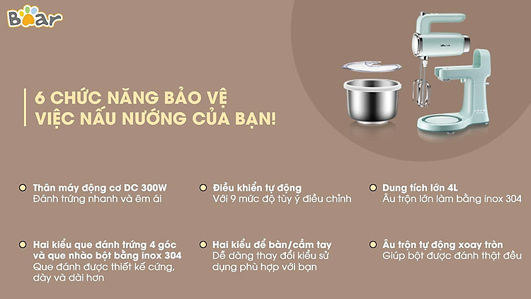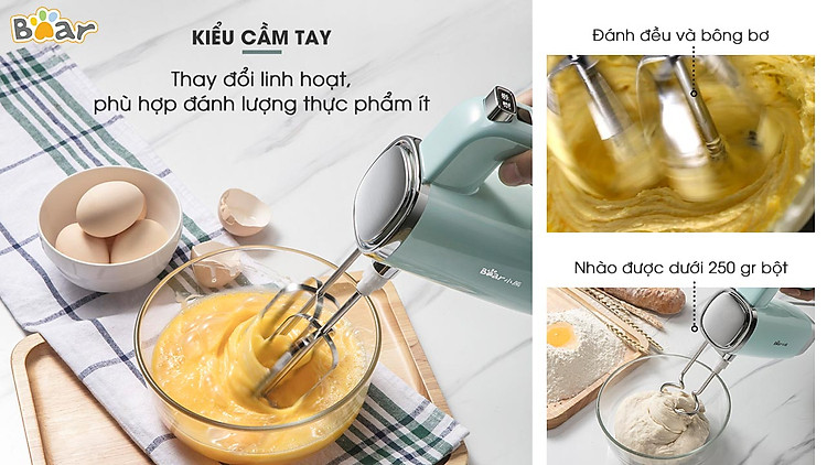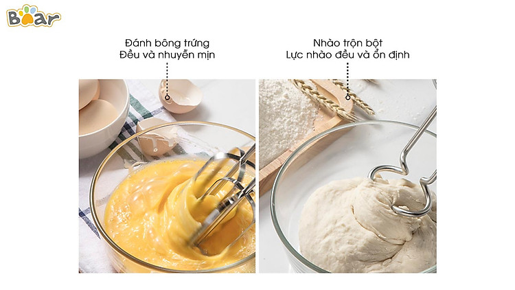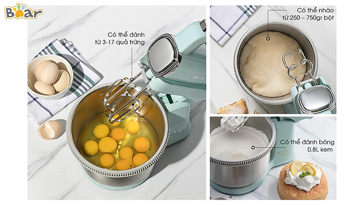 Ngoài ra, máy cũng có tích hợp thêm chức năng khác là đánh trứng và trộn bột. Sự đa năng này chính là ưu điểm rất lớn của các sản phẩm đồ gia dụng Bear so với thị trường.