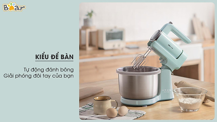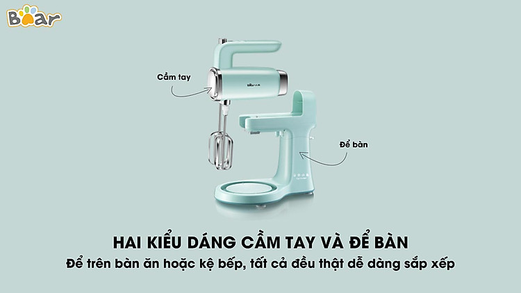 Máy đánh trứng Bear DDQ-B03V1 có 2 kiểu dáng: để bàn và cầm tay. Với kiểu dáng máy đánh trứng để bàn phù hợp khi cần đánh bông một lượng lớn trứng hoặc dùng để trộn bột. Còn trường hợp chỉ cần đánh bột hoặc trứng với lượng ít có thể dễ dàng tháo máy sử dụng như một chiếc máy đánh trứng cầm tay thông thường.