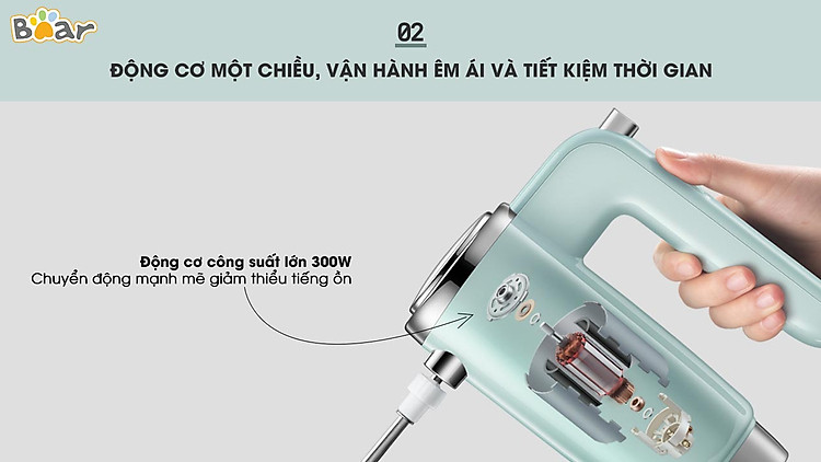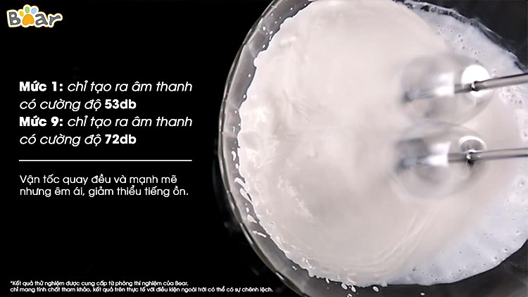 Với công suất lớn 300W, máy đánh trứng Bear giúp cải thiện độ phồng của cốt bánh, để bánh luôn đạt độ bông xốp chắc. Tuy lực đánh của máy mạnh nhưng nhưng động cơ được vận hành êm ái, giảm thiểu tiếng ồn chỉ ở mức 53db ~ tương đương với tiếng nói chuyện bình thường nên sẽ không ảnh hưởng tới xung quanh khi sử dụng.