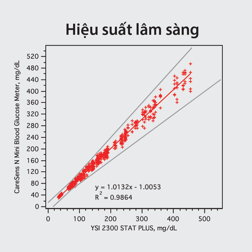 Độ chính xác là yếu tố quan trọng nhất, mang tính tiên quyết đối với những sản phẩm xét nghiệm. Với sản phẩm máy đo đường huyết CareSens N Mini, khách hàng có thể hoàn toàn yên tâm với tính chính xác đã được kiểm định bởi những nhà khoa học hàng đầu trong lĩnh vực tiểu đường. Kết quả sinh hóa thử nghiệm ở phòng thí nghiệm đã chứng minh rằng máy có độ chính xác đến 99%