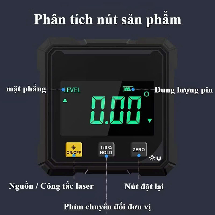 Đo thăng bằng chính xác cao: Cảm biến đo góc nhạy, hiển thị kết quả rõ ràng, hạn chế sai số khi làm việc.