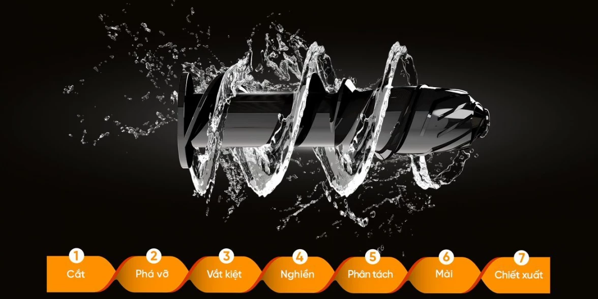 Trục ép ngang thiết kế đường xoắn ốc 7 cấp độ, thách thức mọi loại rau xơ, củ cứng với khả năng ép trái nguyên quả, rau nguyên cây, không gây tắc nghẽn, giúp chiết tách tối đa lượng nước ép từ thực phẩm, vẹn nguyên lượng vitamin, enzyme và chất dinh dưỡng.