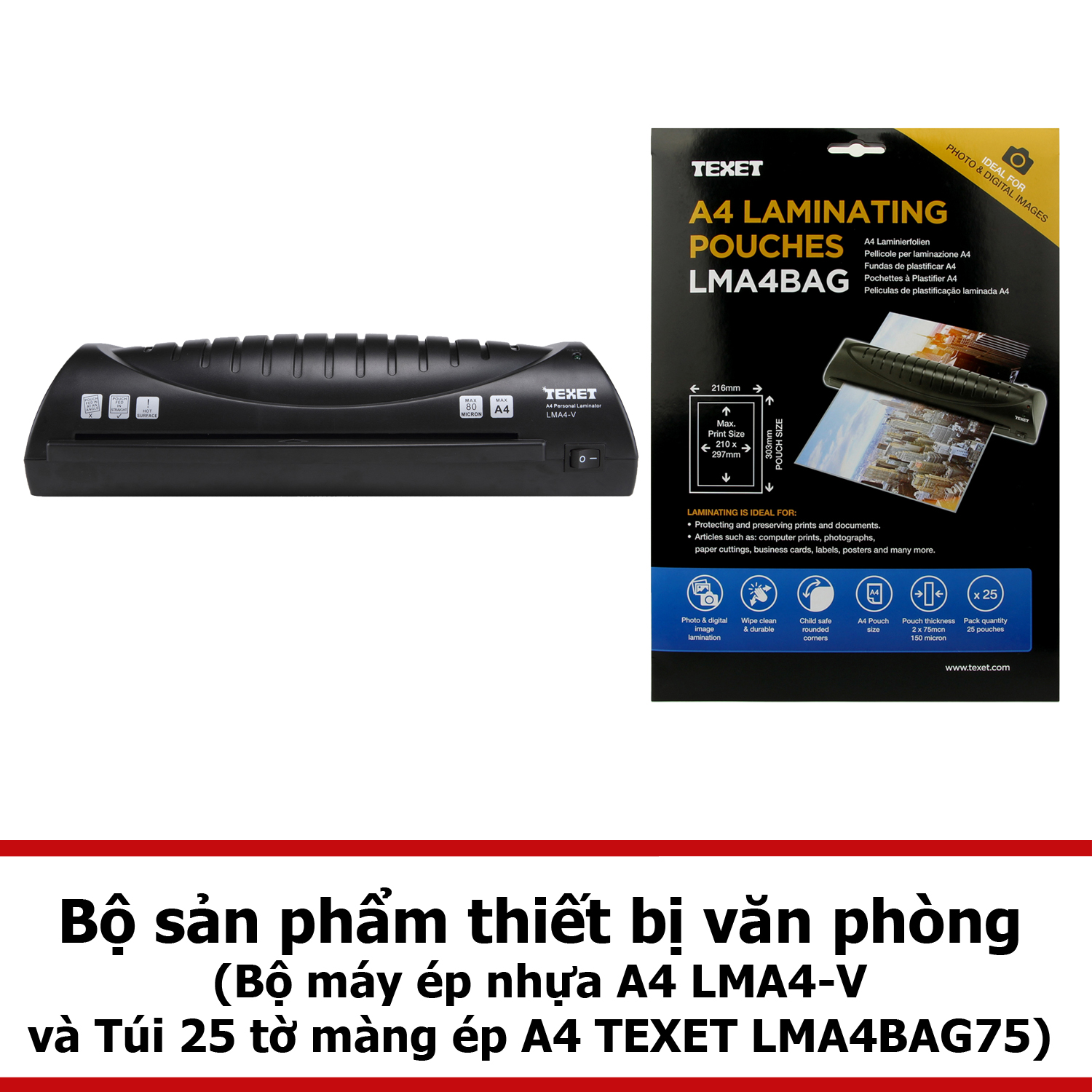 Với Bộ máy ép nhựa A4 LMA4-V và Túi 25 tờ màng ép A4 TEXET LMA4BAG75 bạn vừa có thể tiết kiệm được nhiều thời gian hơn cho những công việc khác‚ vừa có thể an tâm về hiệu quả mà sản phẩm này mang lại.