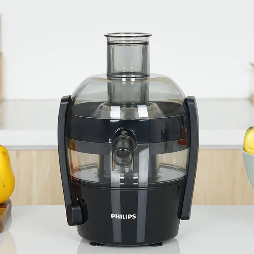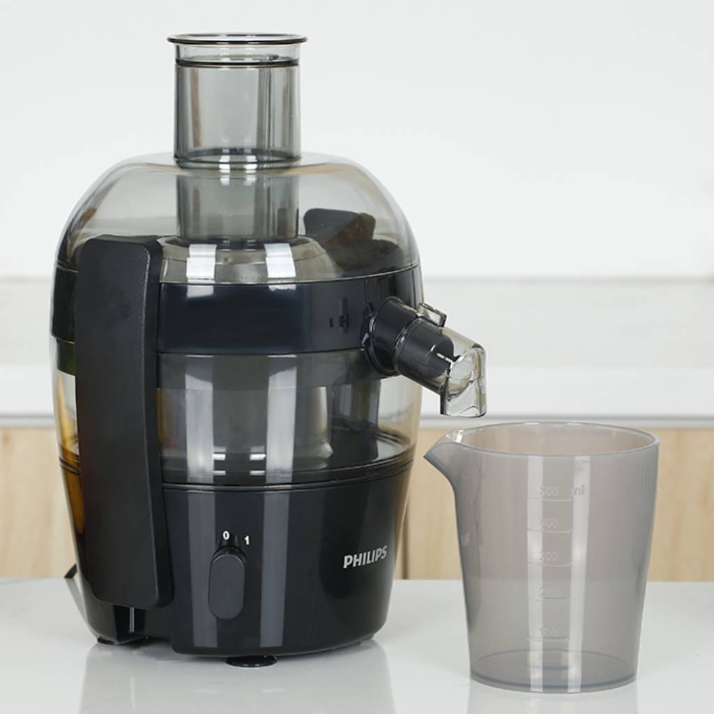 - Máy ép trái cây Philips HR1832/00 thiết kế nhỏ gọn, tone màu đen tối giản phù hợp với mọi không gian bếp.