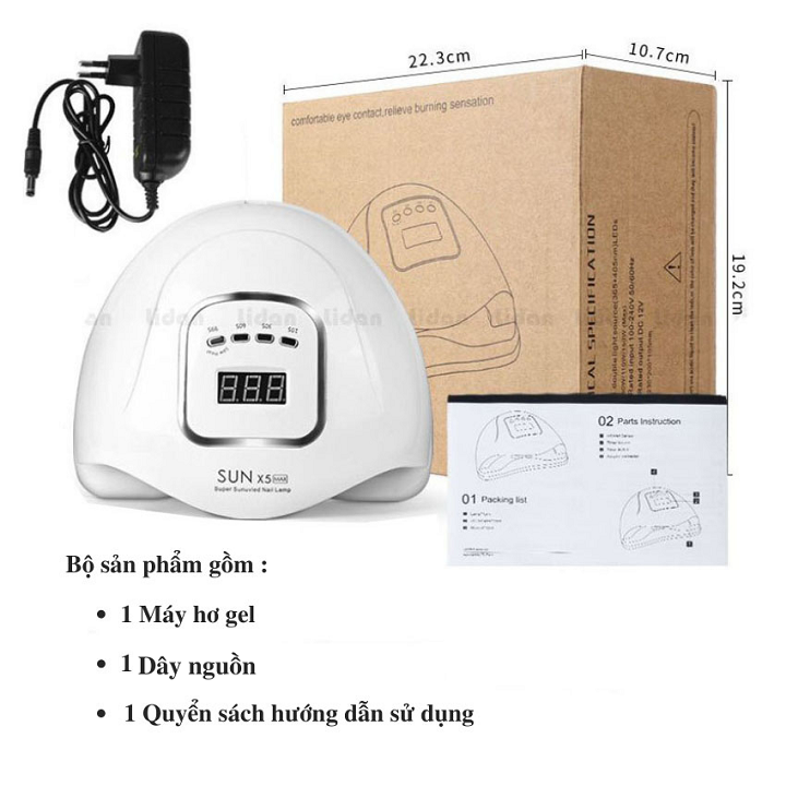 - Thành phần gồm: 1 máy hơ gel sun X5 MAX, 1 dây nguồn, 1 quyển sách hướng dẫn.