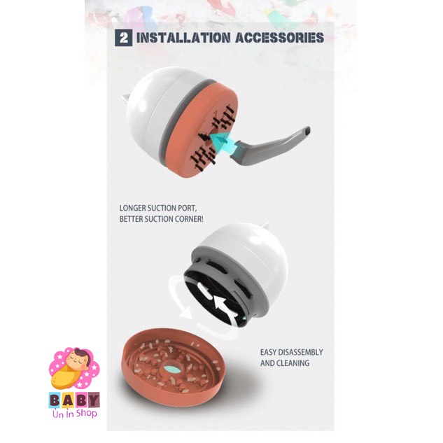 MÔ TẢ SẢN PHẨM: Thiết kế động vật dễ thương Cơ thể nhỏ, hiệu ứng lớn Kích thước nhỏ, dễ mang theo, tiết kiệm không gian Một lần loại bỏ bụi chính Dễ dàng hút các vật nhỏ, vệ sinh sạch sẽ hơn Tạo cho trẻ một môi trường học tập trong lành 360 Tăng hút Quay êm, gió đều, hút sạch Dễ dàng hoạt động Cổng hút mở rộng có thể tháo rời Dễ dàng đối phó với mọi trường hợp nhu cầu môi trường khác nhau Các khe hở nhỏ / góc / bụi cũng có thể được hấp thụ Pin AA 2 * 1.5V Có thể đặt pin Thuận tiện hơn để thay thế Sử dụng thường xuyên có thể đạt 20 - 30 ngày