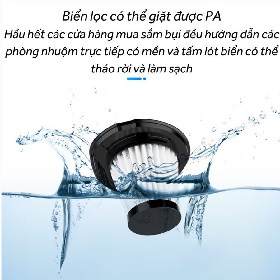 Thông Tin Chi Tiết: Công suất lên đến 120W cho lực hút mạnh mẽ Máy có 2 loại: - Có Dây (dùng cổng điện trên ô tô) - Không Dây (sạc pin và sử dụng nhiều nơi) Nguồn điện 220V Công suất: 120W Lực hút: 4500 PA Vòng quay động cơ: 22800rpm (vòng/phút) Bộ lọc: PM 2.5 (lọc cả bụi) Thể tích ngăn chứa bụi: 0.5 lít Độ ồn: < 55DB (cực êm) Dây cáp USB 1.05 (m) Điện đầu vào 5V, đầu ra 9V Kích thước: 35 x 10 x 6 (cm) Pin sạc có dung lượng lên tới 2200 mAh Thiết kế: không dây, sang trọng, nhỏ gọn, tay cầm thuận tiện đi kèm nhiều loại đầu hút Thời gian sạc đầy pin: 2-3 giờ. Thời gian dùng liên tục lên đến 15-20 phút. Bộ lọc Hepa có thể rửa sạch tái sử dụng nhiều lần
