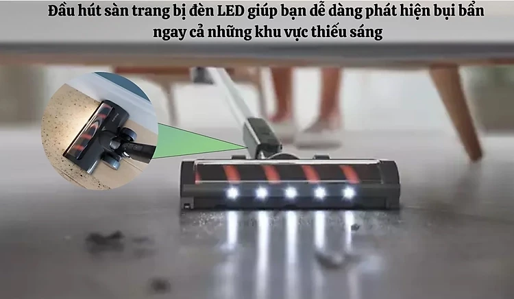 Máy hút bụi không dây Philips XC3031/01 có đầu hút bụi được trang bị đèn LED giúp bạn thấy rõ được nơi đang làm sạch và nhanh chóng phát hiện các loại bụi bẩn có kích thước nhỏ. Từ đó cho khả năng hút bụi hiệu quả ngay cả những khu vực thiếu sáng như: gầm tủ, gầm ghế,... Bên cạnh đó, đầu hút được thiết kế để tiếp cận những khu vực như chân tường giúp hút sạch mọi bụi bẩn cứng đầu.