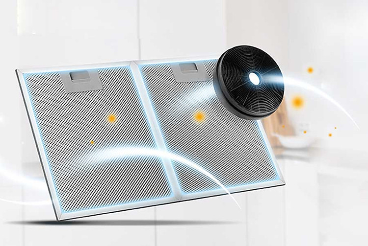 Hệ thống lọc khử mùi bằng than hoạt tính có tác dụng khử mùi, lọc không khí tạo ra không khí trong lành và sạch sẽ lên đến 99% trong không gian bếp.