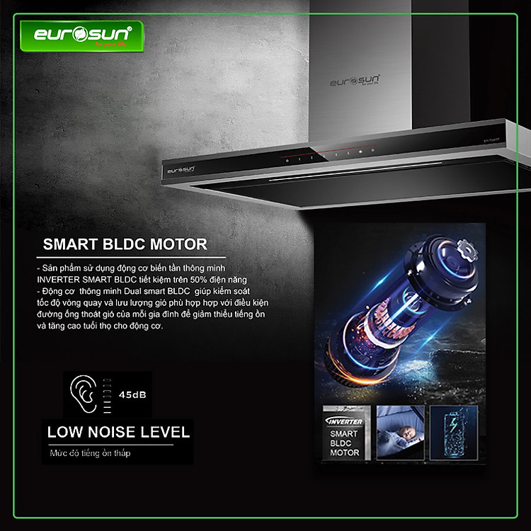 Máy Hút mùi Eurosun EH-70AF77 sử dụng động cơ biến tần thông minh INVERTER BLDC giúp tiết < 50% điện năng, giảm độ ồn < 40% so với động cơ thông thường.