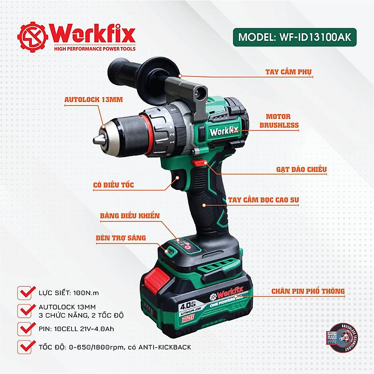 Máy Khoan 3 Chức Năng 100N.m Workfix - ID13100AK - Đầu Kẹp 13mm Auto Lock - Chống Lật Cổ Tay Anti Kickback - Brushless Motor - Chân Pin Phổ Thông - 2 Pin 21V/4Ah PLUS - Có Tay Cầm Trợ Lực - Bảo Hành Chính Hãg 6 Tháng