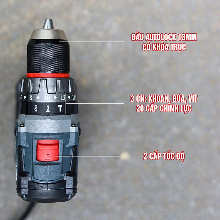 - 3 chức năng khoan: khoan thường, bắt vít, khoan búa