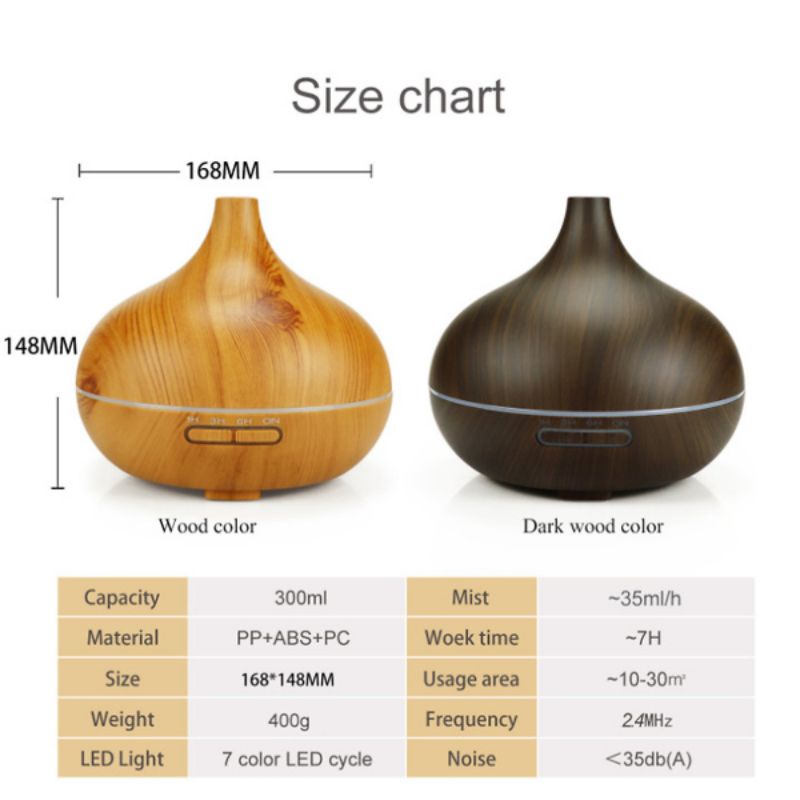 1. Dung Tích nước : 550ml 2. Kích Thước : 165*H120mm 3. Nguồn vào : AC100-240V 50/60Hz; 4. Nguồn ra : DC 24V 650mA 5. Diện tích khuếch tán : DƯỚI 35M2 6. Thời gian hoạt động liên tục : 6 - 10 giờ