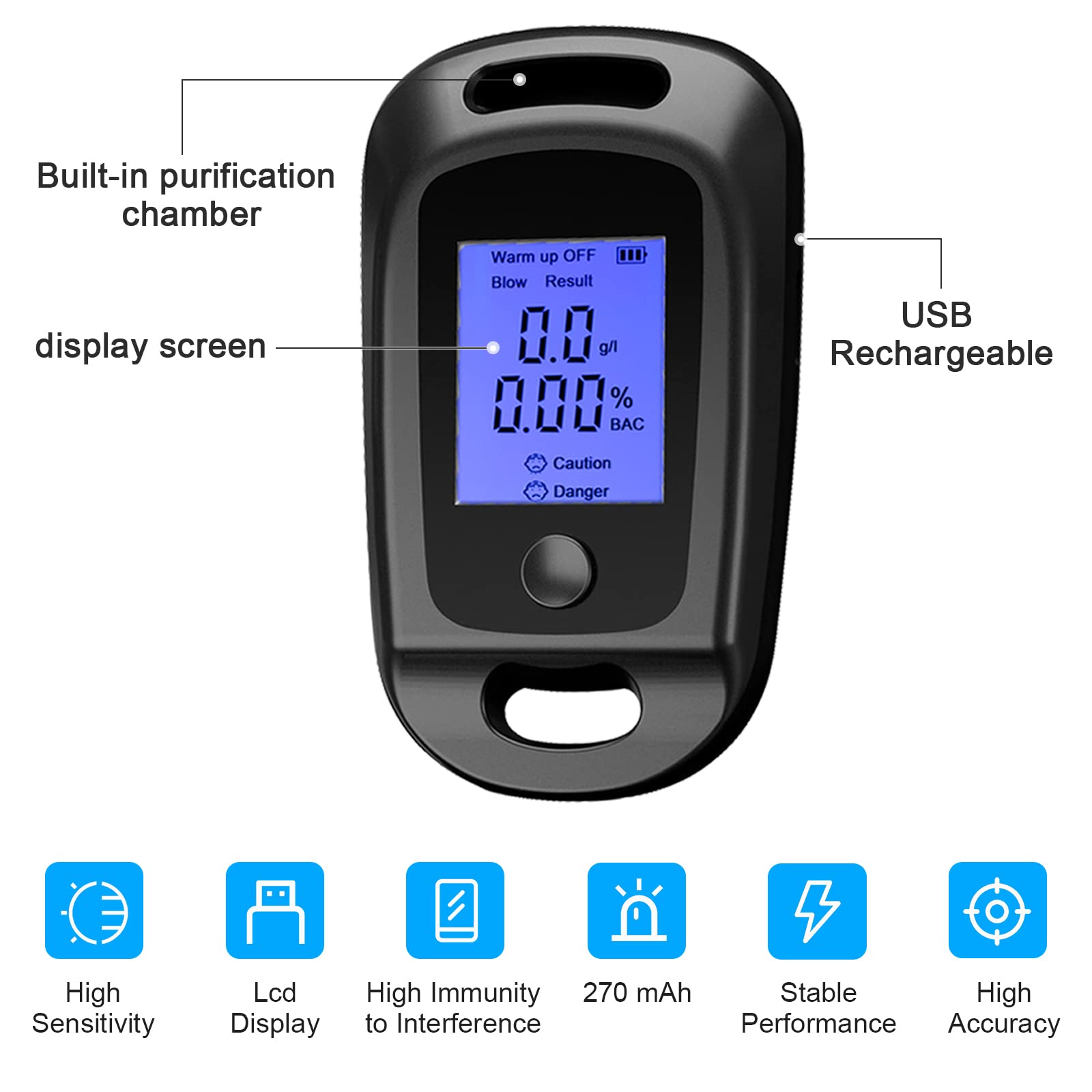 DI ĐỘNG: Máy đo nồng độ cồn có thể sạc lại có kích thước nhỏ và trọng lượng nhẹ, nhỏ gọn và di động, sẽ không chiếm quá nhiều diện tích, dễ dàng mang theo và sử dụng.