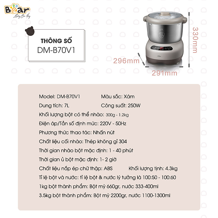 Máy Trộn Bột 7L Bear DM-B70V1 (HMJ-A70C1) với dung tích 7L, động cơ mạnh mẽ giúp bạn nhào bột làm bánh nhanh chóng và thật đơn giản. Thiết kế thời trang nhỏ gọn phù hợp với mọi căn bếp, cùng Bear Việt Nam trải nghiệm ngay DM-B70V1 (HMJ-A70C1) dung tích 7L nhé.
