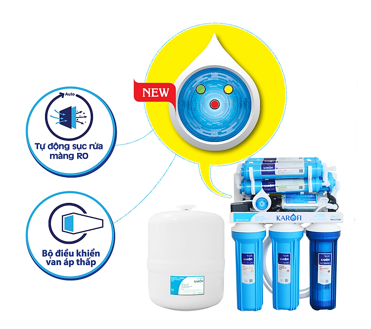Bình áp nhựa, áp thép siêu bền, vòi Karofi công nghệ Mỹ, tủ IQ sang trọng, van điện từ KSD tự động, bơm hút Karofi êm ái có thể hút sâu tới 2m….