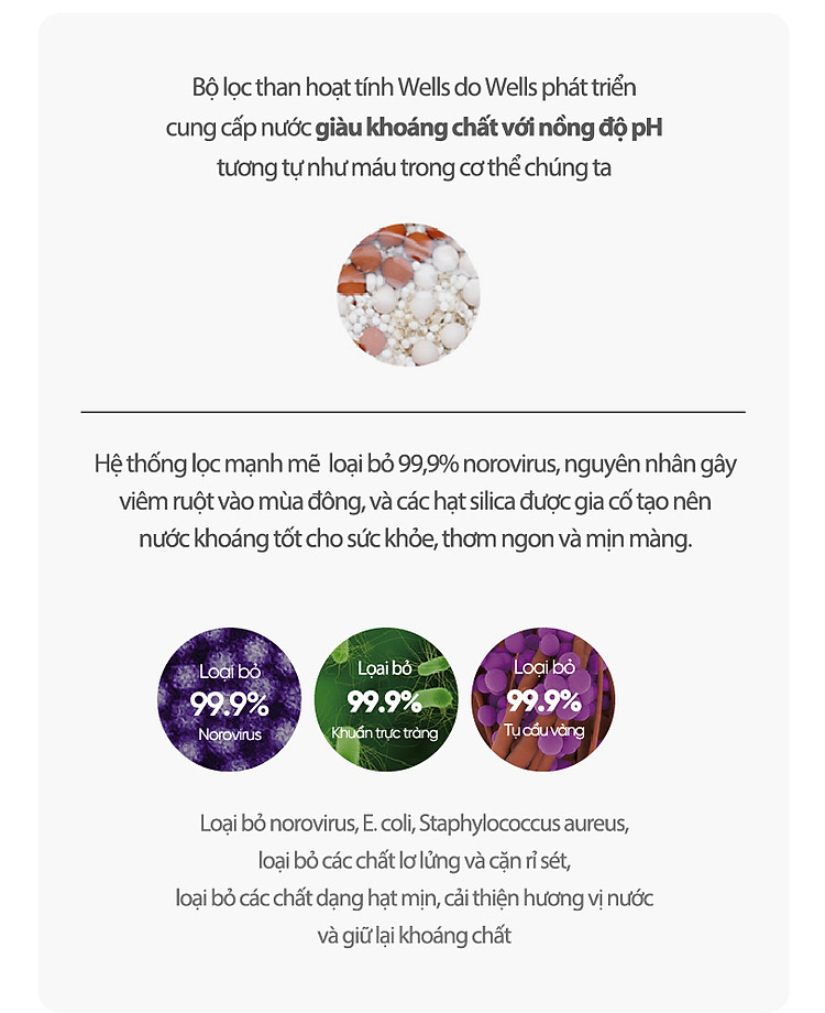 Bộ lọc Carbon Wells: Loại bỏ 4 kim loại nặng, khử mùi, loại bỏ vi khuẩn, giữ nguyên khoáng chất tự nhiên và duy trì độ pH ổn định.