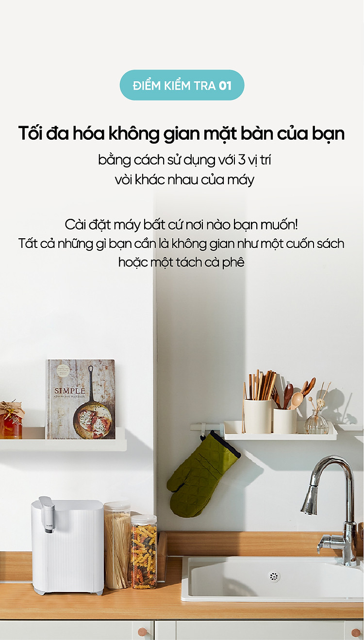Máy lọc nước Wells New Mini nổi bật với thiết kế để bàn siêu mỏng chỉ 9cm, phù hợp mọi không gian bếp hiện đại. Kiểu dáng tối giản, thanh lịch giúp tiết kiệm diện tích, đồng thời tạo điểm nhấn sang trọng cho căn bếp. Với khả năng xoay vòi 3 hướng và khay xoay 180°, Wells New Mini dễ dàng thích ứng với mọi bố trí nội thất.