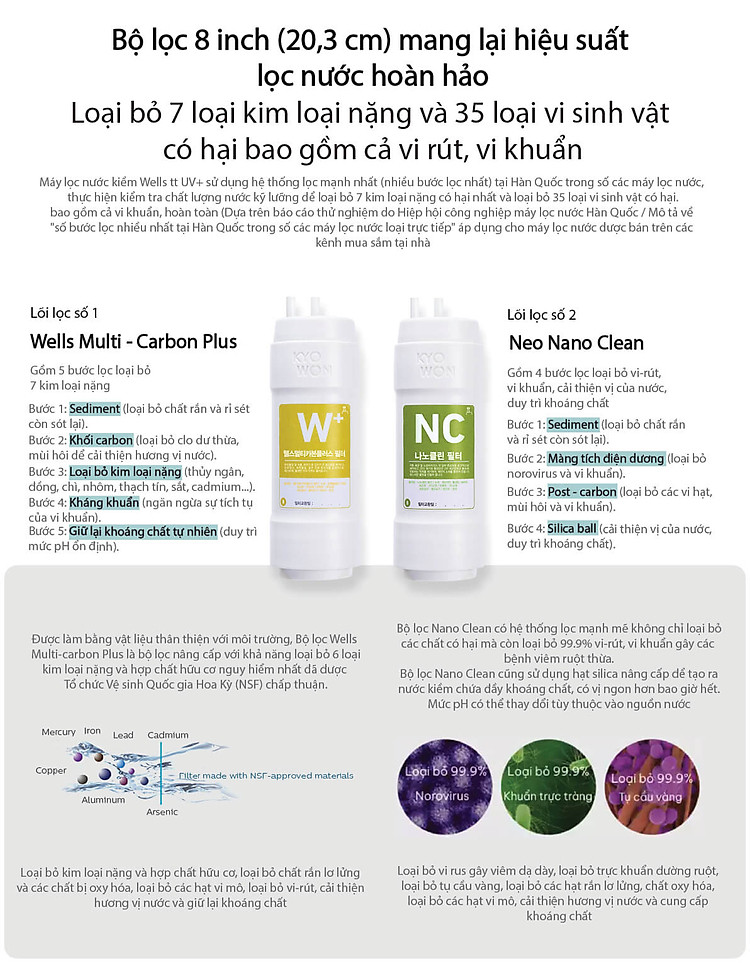 | Bộ lọc | Wells Multi Carbon Plus và Nano Clean (lọc 9 giai đoạn) |