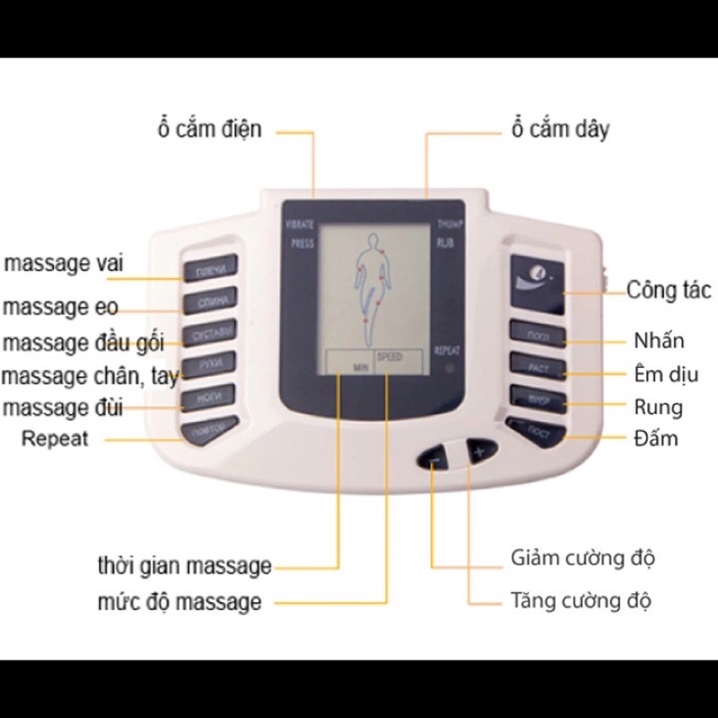 ⇒ Máy Massage xung điện hỗ trợ giảm vai cứng, chứng liệt thần kinh đầu, chứng đau dây thần kinh, đau xương ống chân, mệt mỏi toàn cơ thể, đau bao tử, cảm lạnh, đau cổ cột sống, khớp, đau răng, huyết áp cao, huyết áp thấp, mất sức lực, kinh nguyệt không đều, bệnh mãn tính cấp tính khác nhau.