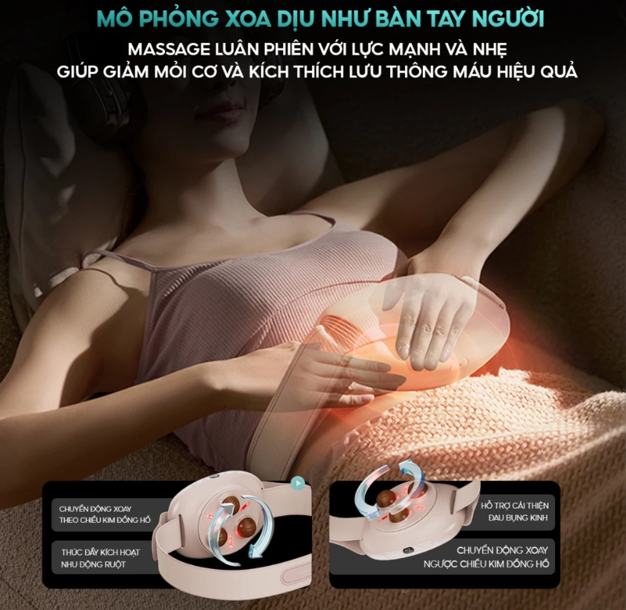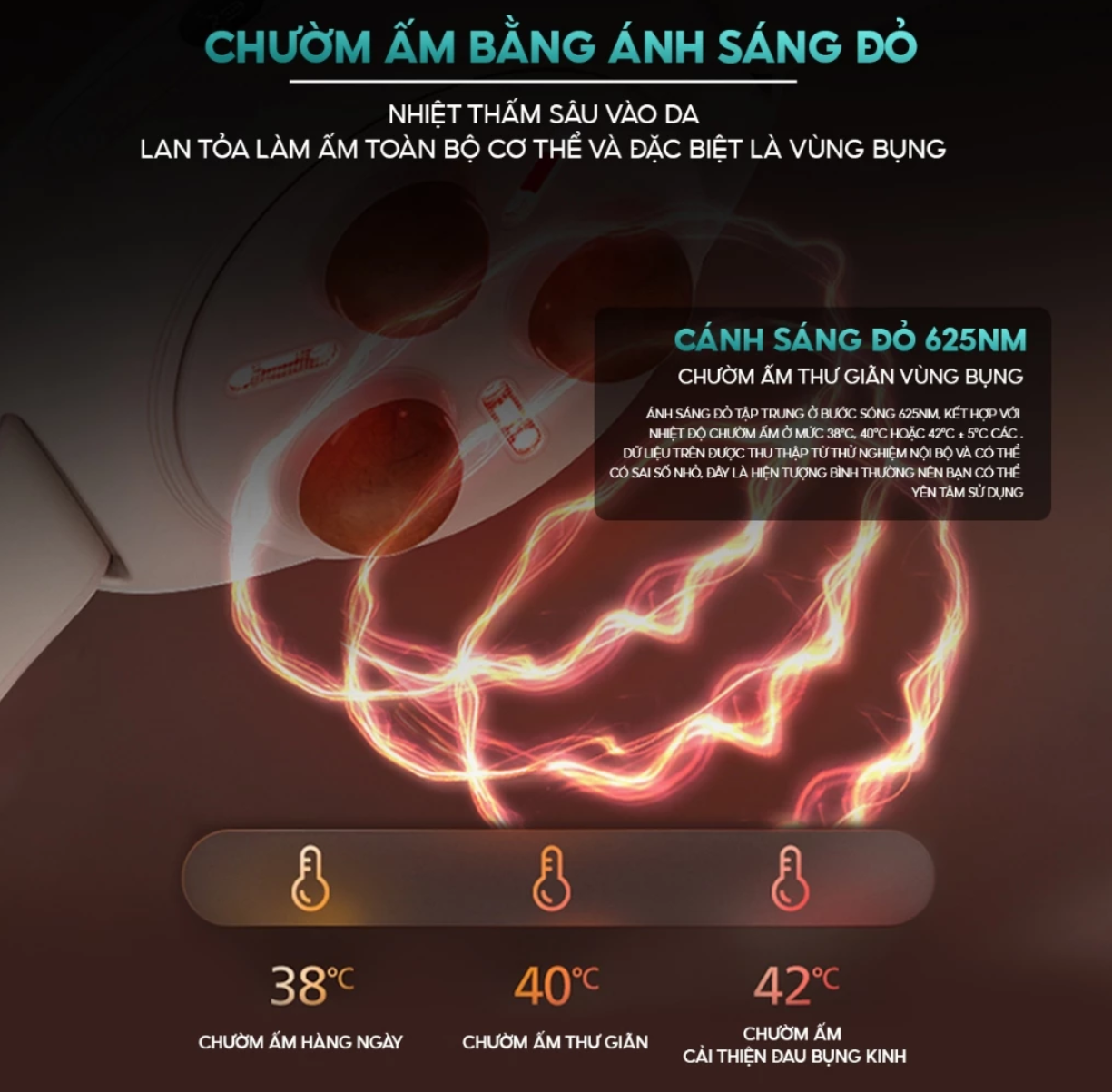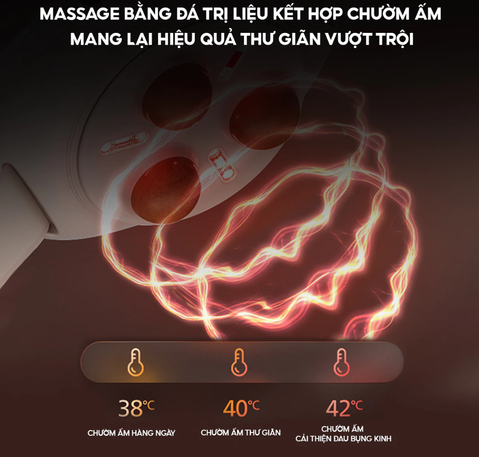 ️Chườm ấm bằng ánh sáng đỏ công nghệ mới: Tích hợp công nghệ quang nhiệt 625nm với 3 mức nhiệt linh hoạt (38°C, 40°C, 42°C), hỗ trợ giảm đau bụng kinh, thư giãn hàng ngày và cải thiện tuần hoàn máu.