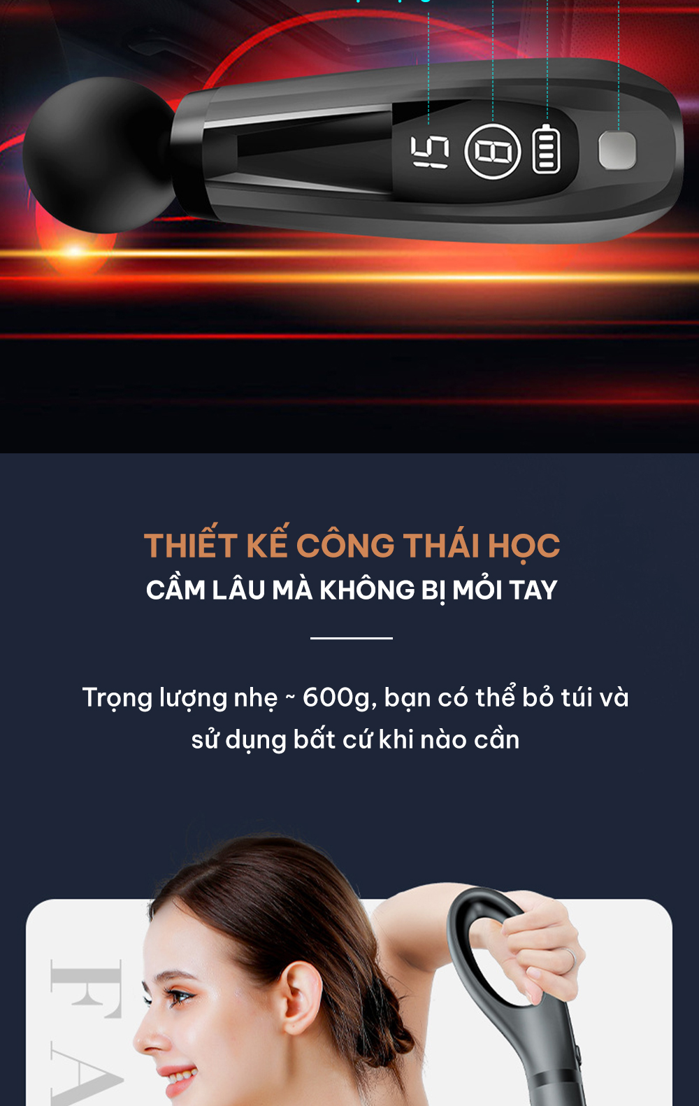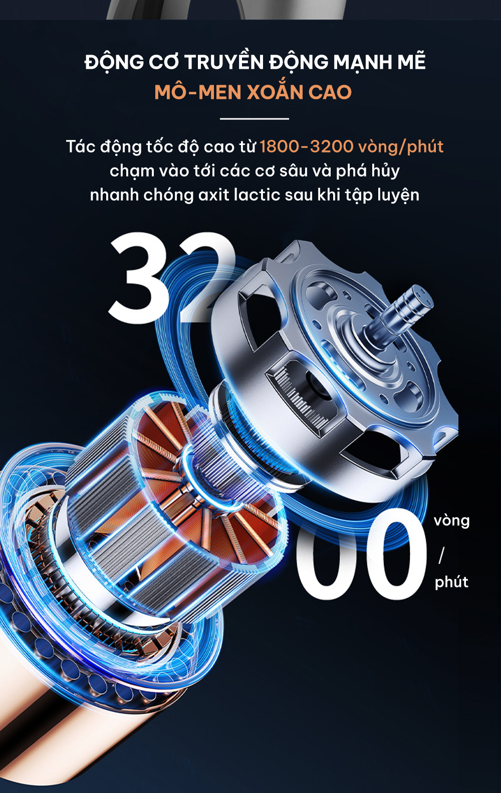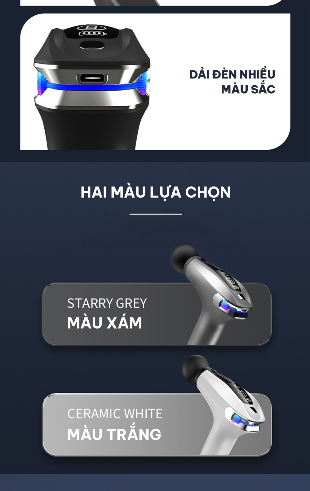 ✦ Máy Massage cầm tay có kiểu dáng thể thao mang lại trải nghiệm mới về Massage sâu với các tính năng điều chỉnh nhiều cấp độ, tay cầm trợ lực kéo dài, dải đèn trang trí nhiều màu sắc