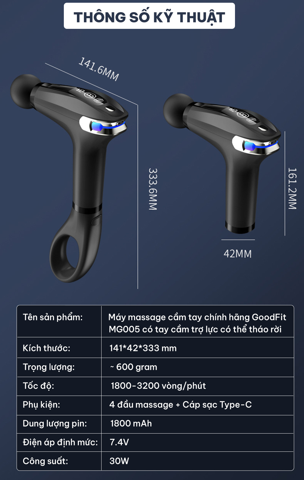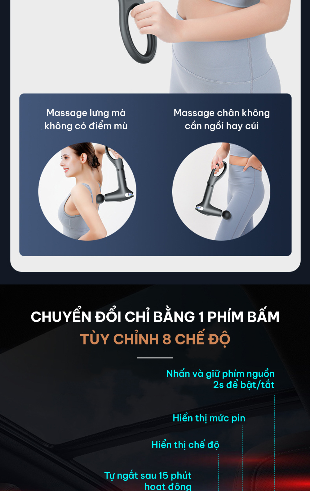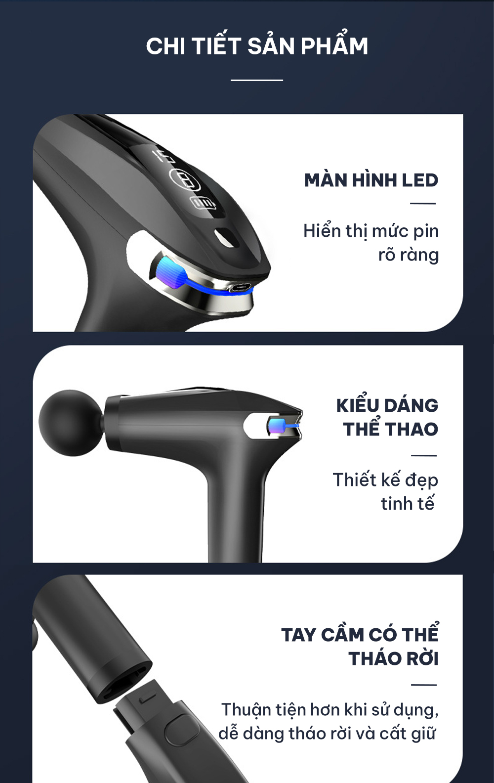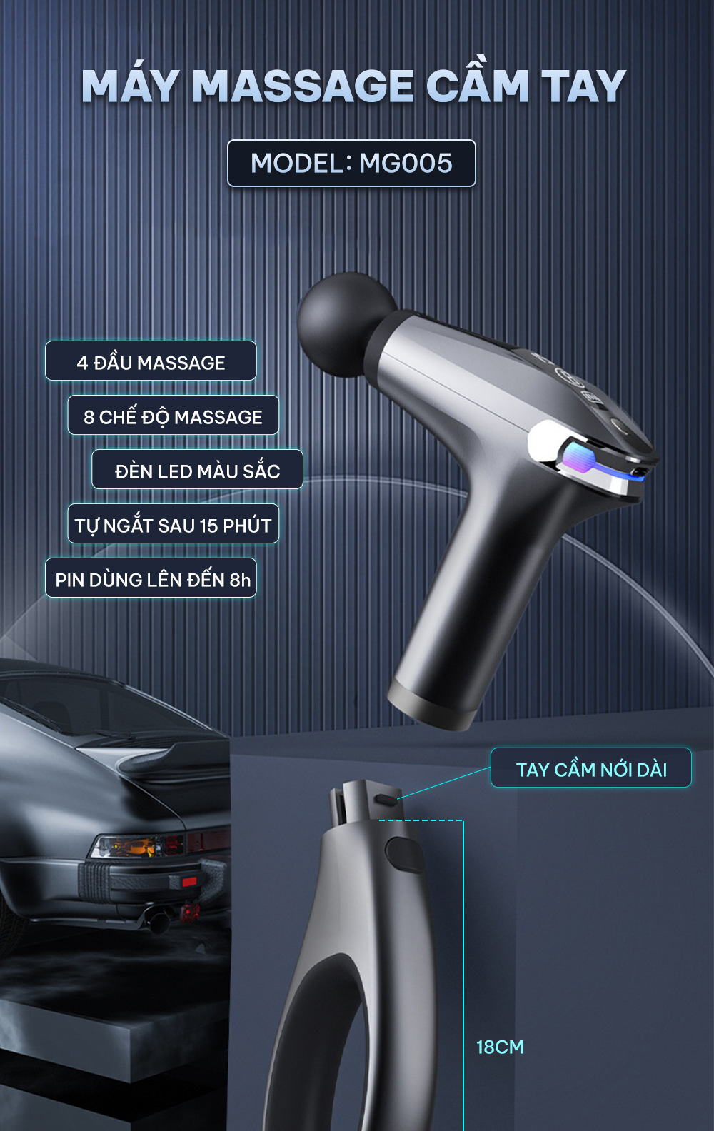 ✦ Máy Massage cầm tay có kiểu dáng thể thao mang lại trải nghiệm mới về Massage sâu với các tính năng điều chỉnh nhiều cấp độ, tay cầm trợ lực kéo dài, dải đèn trang trí nhiều màu sắc