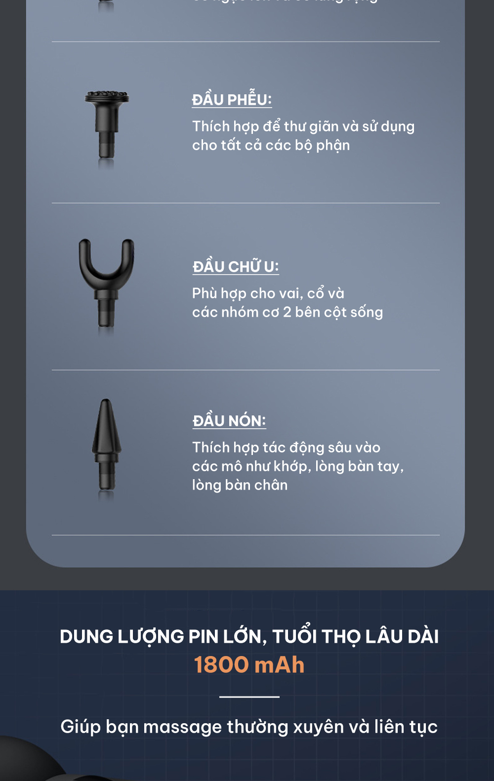 ✦Máy Massage có 4 loại đầu Massage nhắm vào những vùng cơ khác nhau