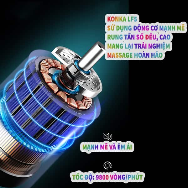 Động cơ với mô-men xoắn cao mạnh mẽ, có tần số cao với xung động từ 400 – 12.000 vòng/phút (tùy chỉnh), Konka LF5 sẽ dễ dàng Massage cực sâu bên trong, giải phóng Axid Lactic chống mỏi cơ, đốt cháy cacbonhydrat giúp giảm nhanh mỡ thừa, lấy lại vóc dáng săn chắc. Công nghệ lướt nhẹ, Siêu im lặng khi mát-xa.